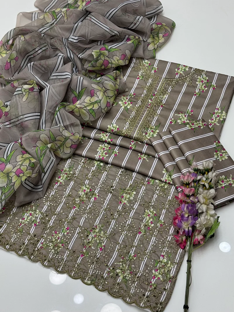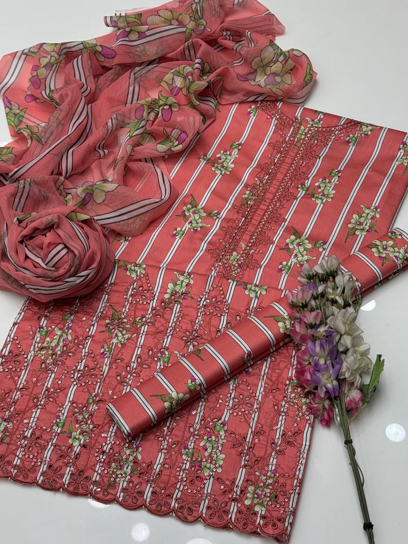 Most Beautiful And Elegant Chikankari & Sequence Work ๐งต Digital Printed Lawn Shirt & Trouser With Chiffion Printed Duppata 3 Pc Dress ๐