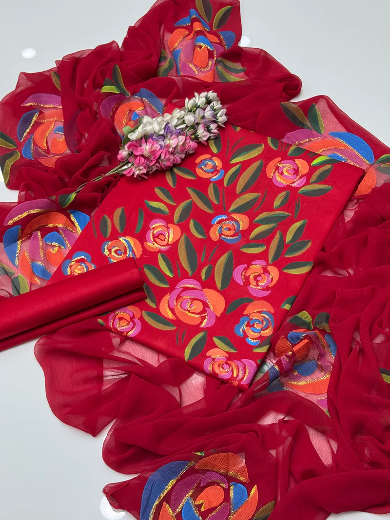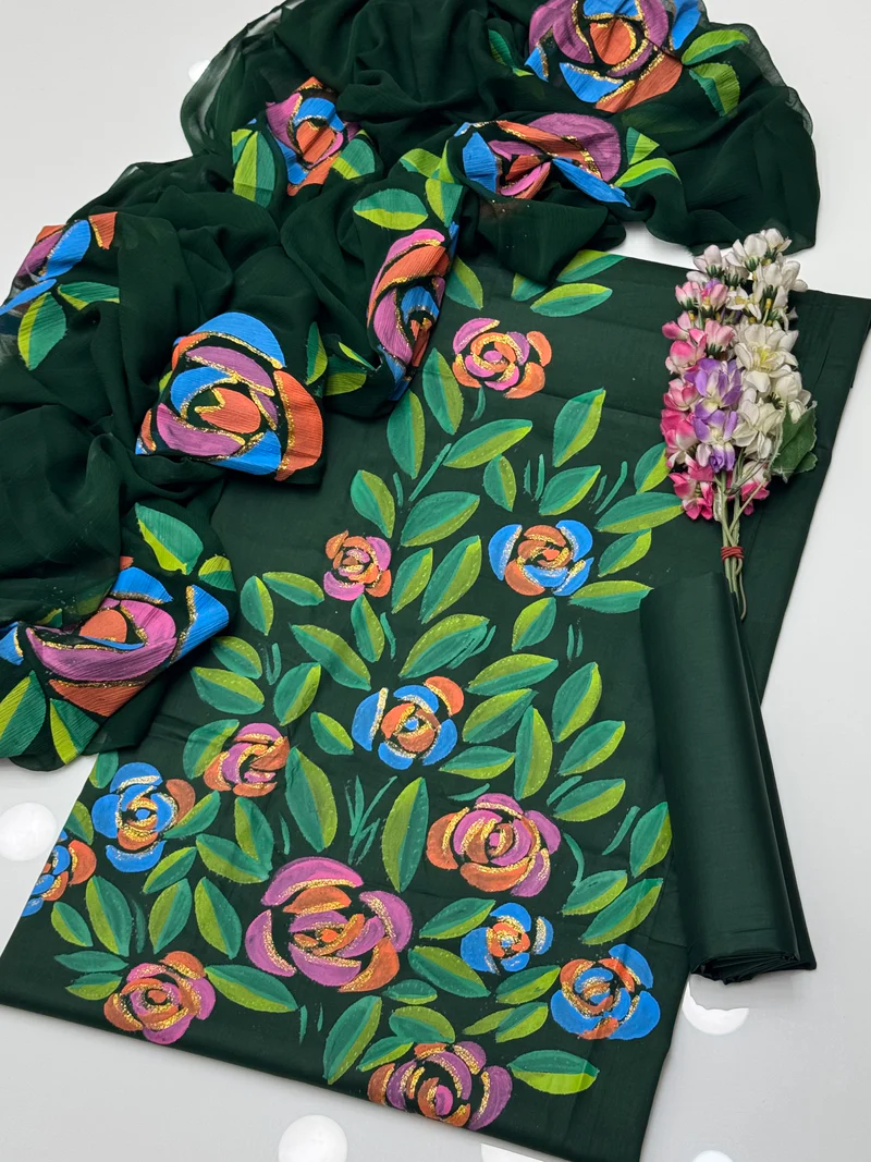 Beautiful Handmade Oil Painted 🎨 Pure Lawn With Chiffion Duppata 3 Pc Dress