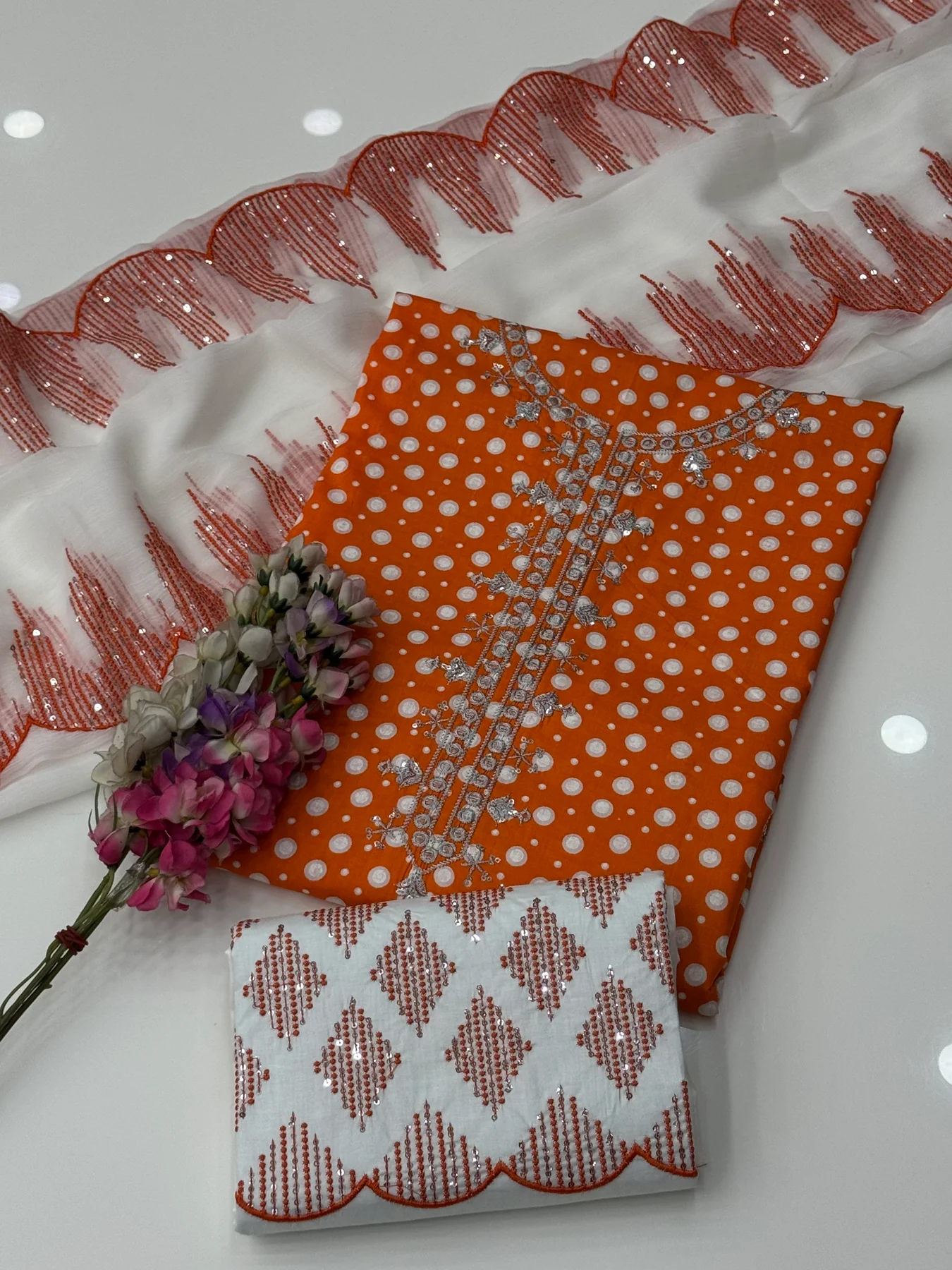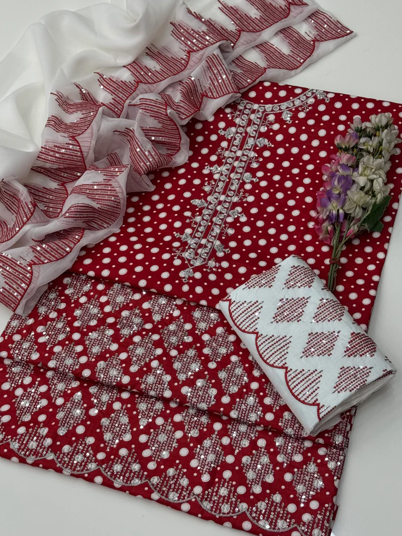Beautiful Sequence Work Embroidery ๐Ÿงต Polka Dot Printed Lawn Shirt , Embroidered Trouser Along With Chiffion Sequence Work Duppata 3 Pc Dress ๐Ÿ‘—