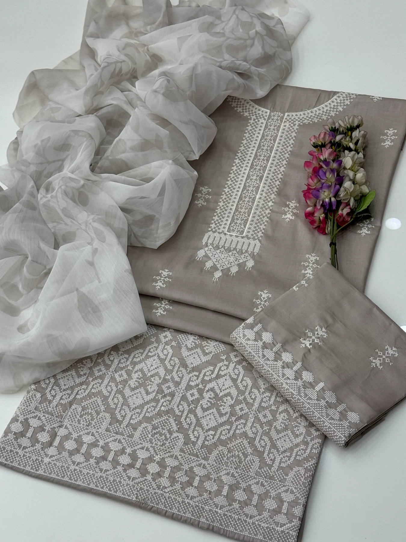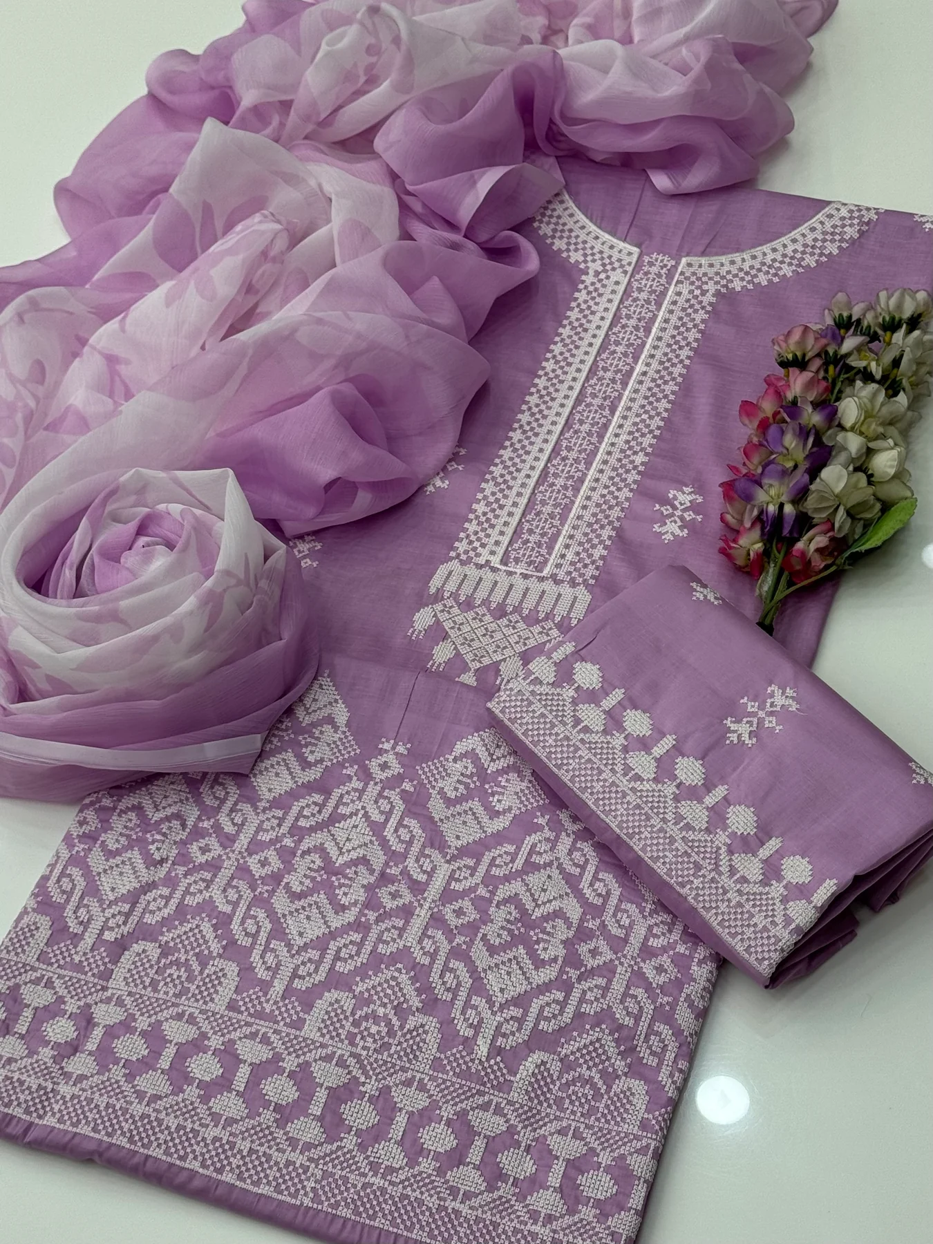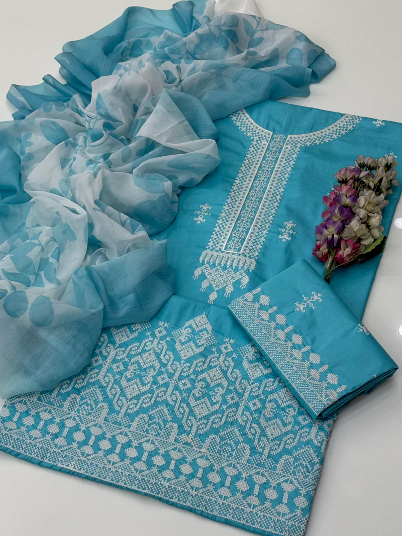 Beautiful Handmade Style Cross Stitch Computer Embroidery Lawn Shirt & Trouser Along With Printed Chiffion Duppata 3 Pc 👗