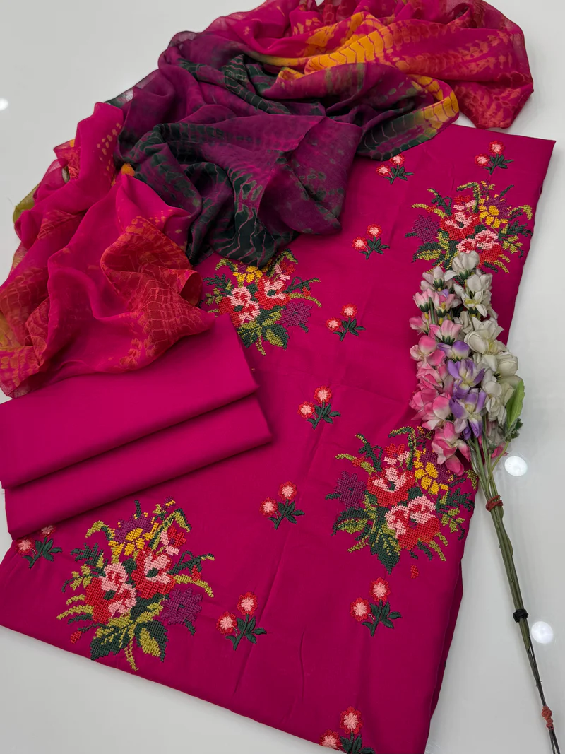 Handmade Style Cross Stitch Tanka Embroidered Lawn Shirt And Trouser With Tye N Dye Chiffion Duppata 3 Pc Dress 👗
